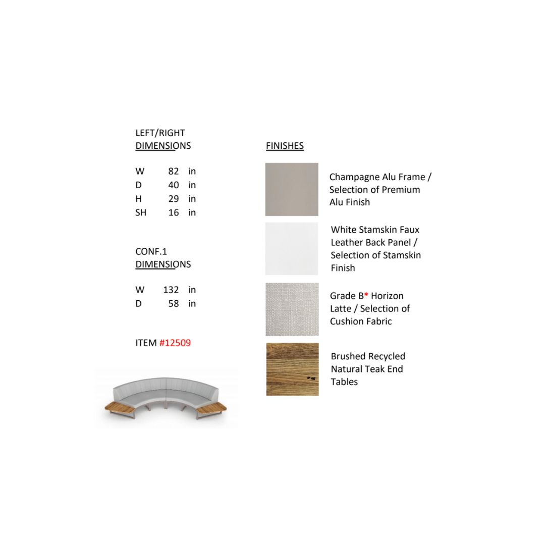 | Finishes | Brushed Recycled Natural Teak End Tables, Champagne Alu Frame / Selection of Premium Alu Finish, Grade B* Horizon Latte / Selection of Cushion Fabric, White Stamskin Faux Leather Back Panel / Selection of Stamskin Finish |