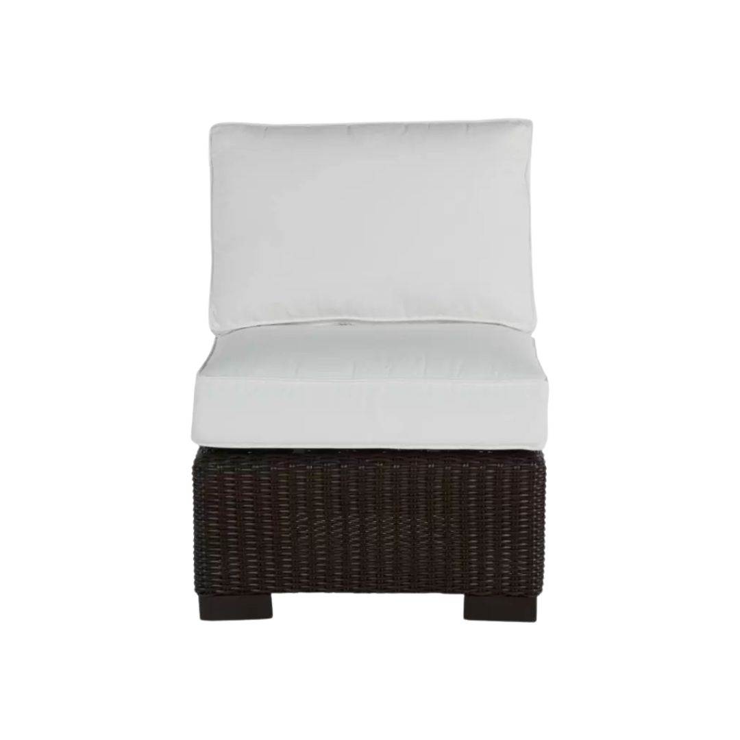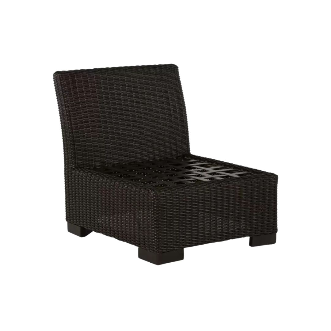 The Club Woven Slipper Chair combines with other pieces in the collection to form a loveseat or sofa; or use the slipper chair for comfortable stand-alone seating. Constructed from highly weather-resistant N-dura™ resin wicker with asturdy wrought aluminum frame, this chair will last for years of enjoyment. Resin-wicker and wrought aluminum construction for years of use Exceptionally rot- and mildew-resistant Plush all-weather cushions.
