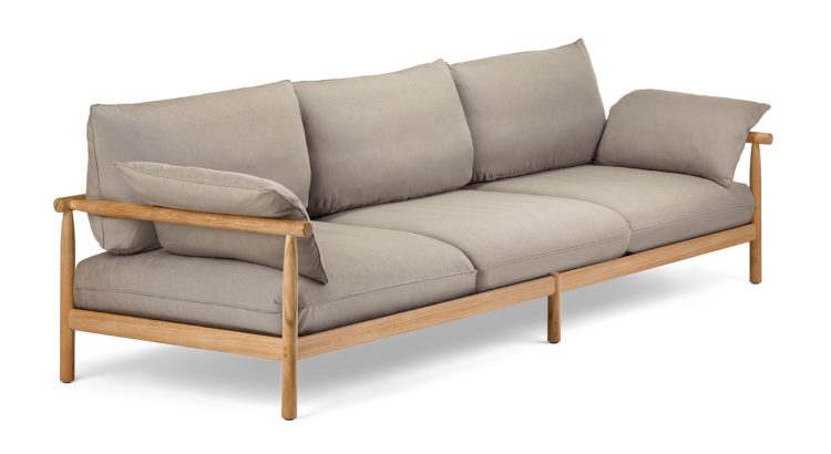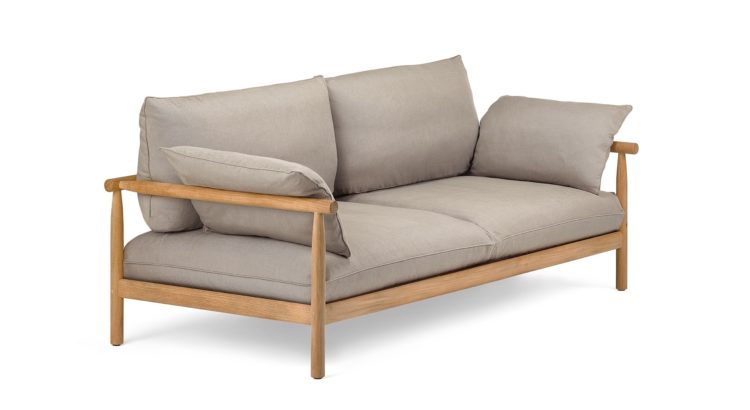 Transitioning the TIBBO concept into lounging, this deep and wide XL Lounge Chair in a mix of teak, textiles and woven fiber features high-quality cushions for luxurious sitting comfort. It is lightweight and easy to reposition. The frame consists of premium teak, with woven fiber for the seating